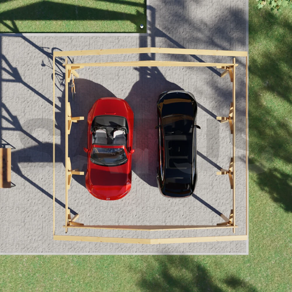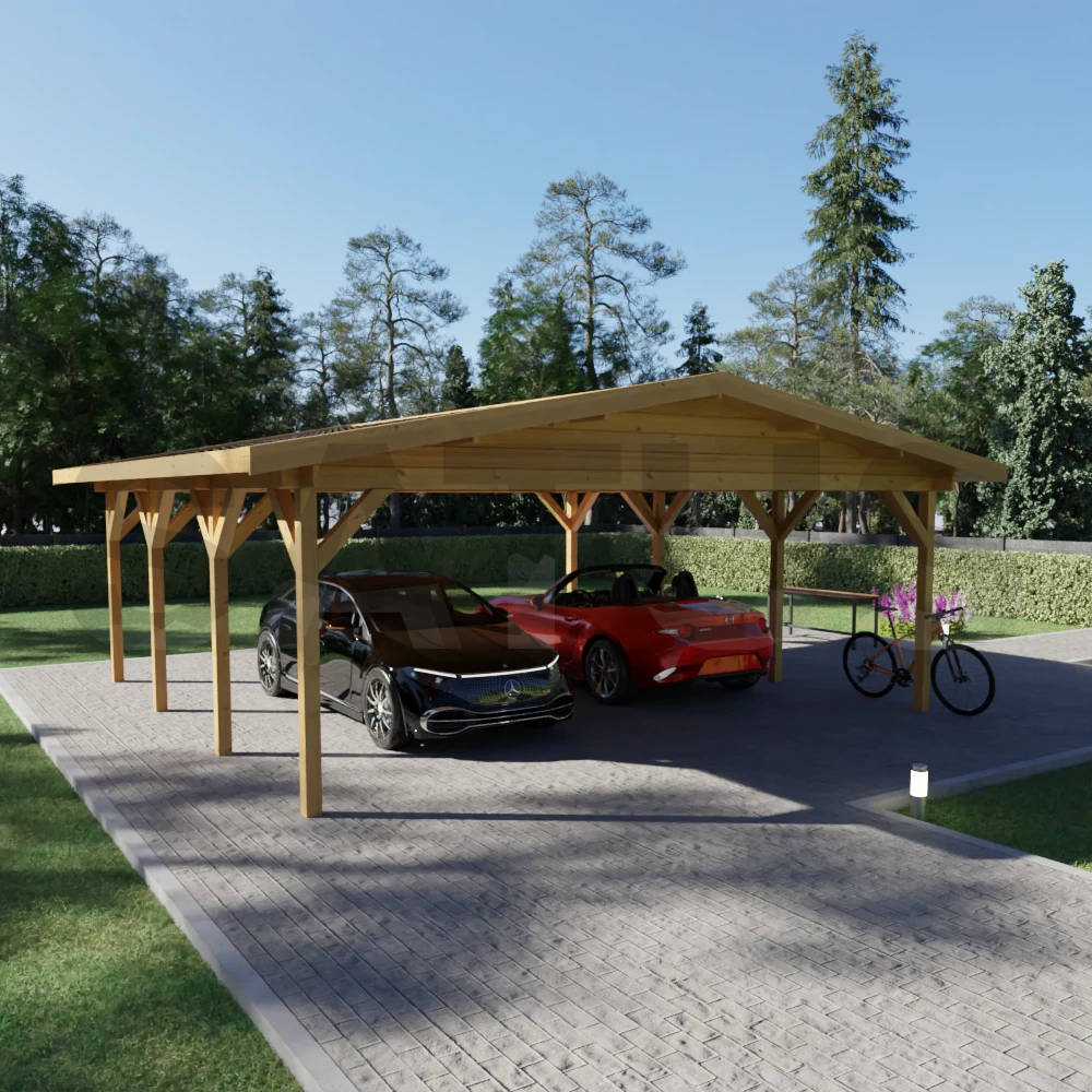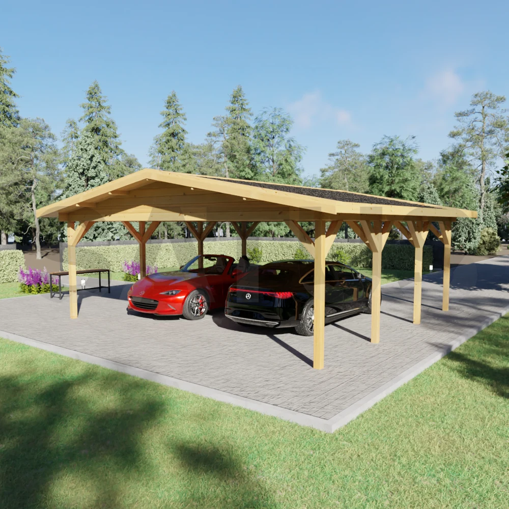 Una cochera de estilo tradicional para dos coches, que también puede servir como pabellón sombreado para reuniones y momentos al aire libre.