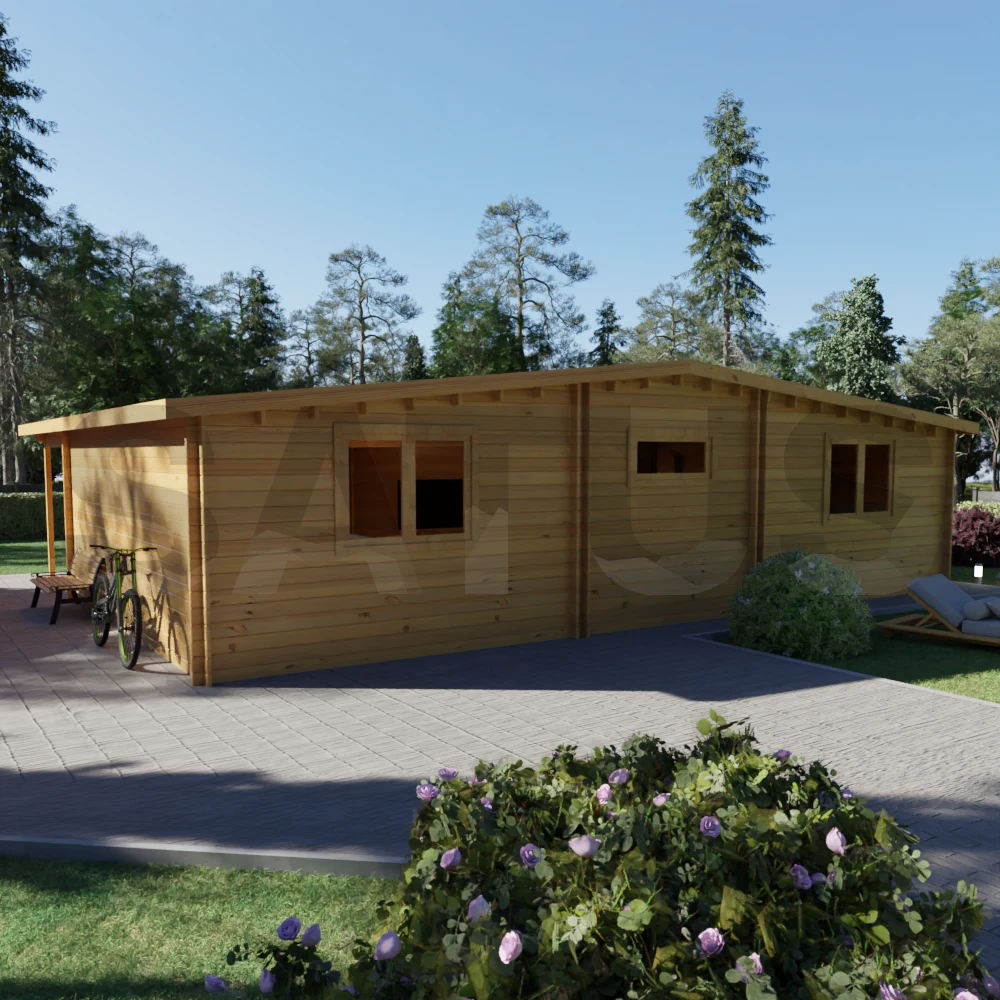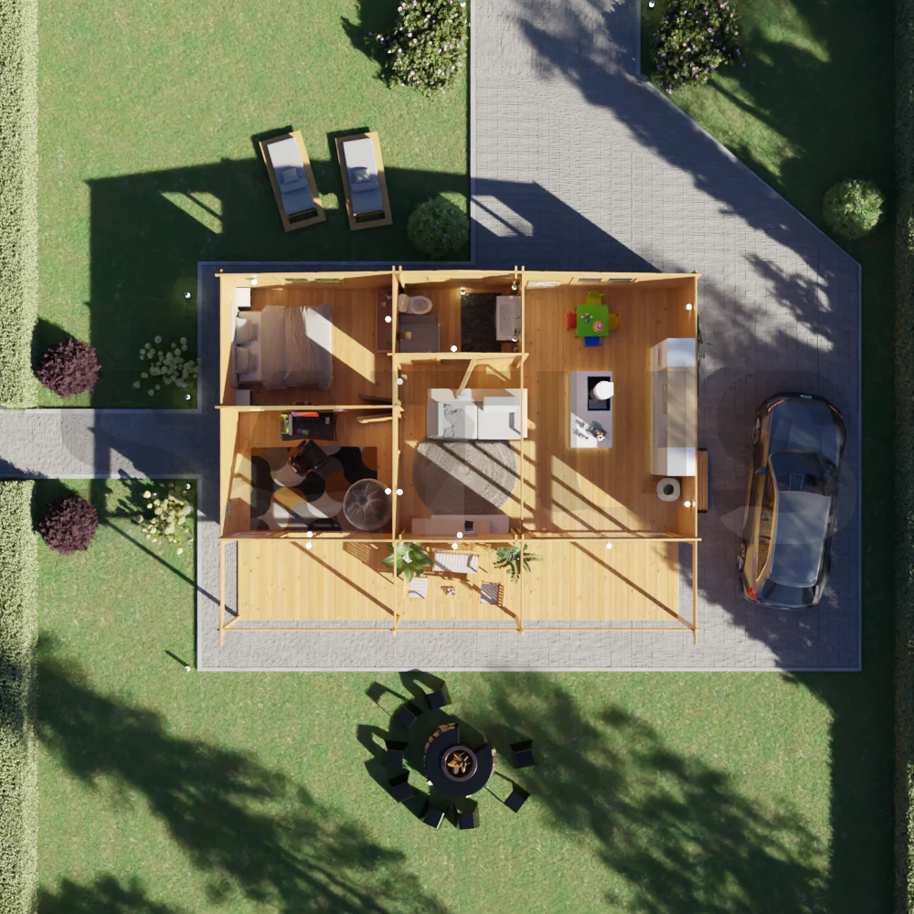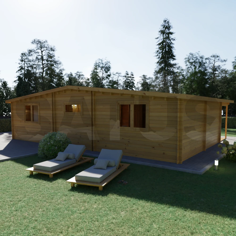 La Cabaña Tradicional “Coruña” es una vivienda de madera prefabricada de una planta con un tejado a dos aguas clásico, diseñada para ofrecer comodidad y funcionalidad a toda la familia.
