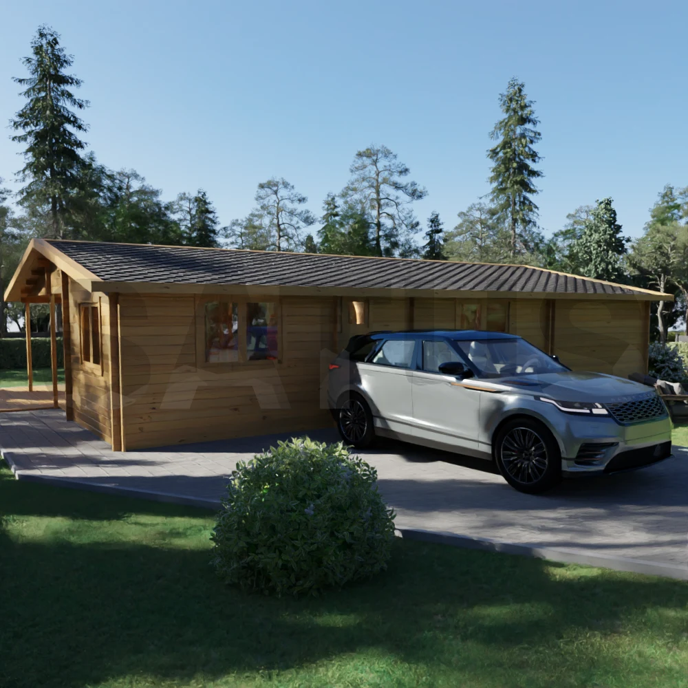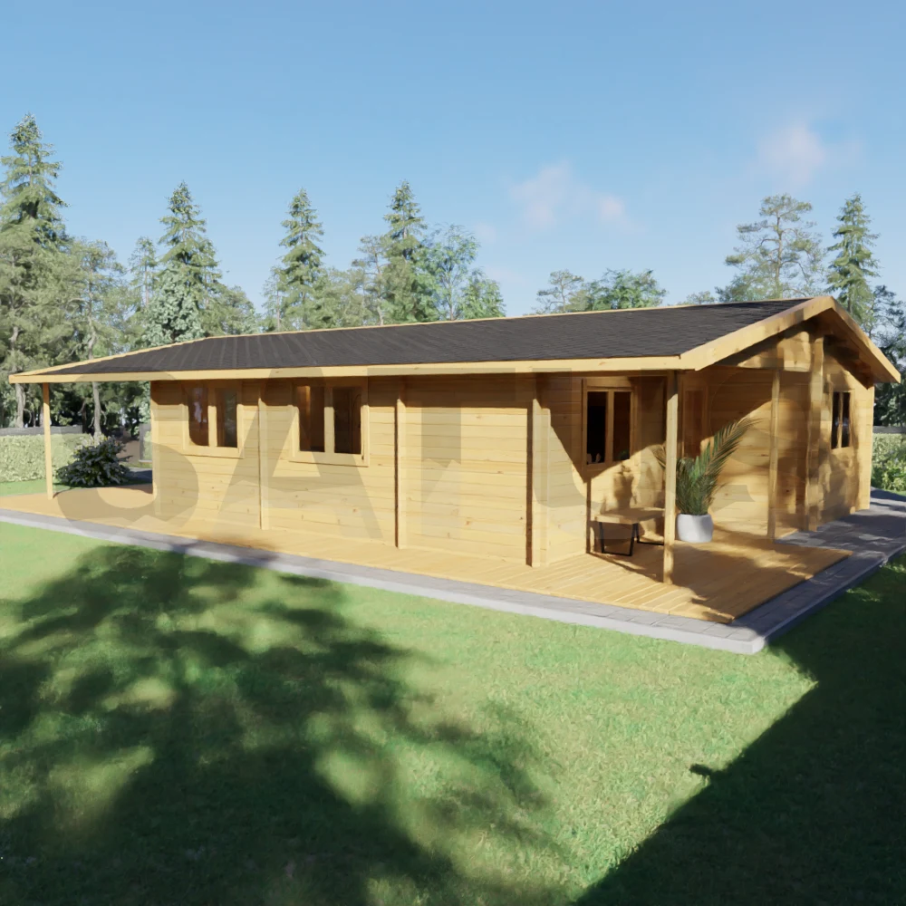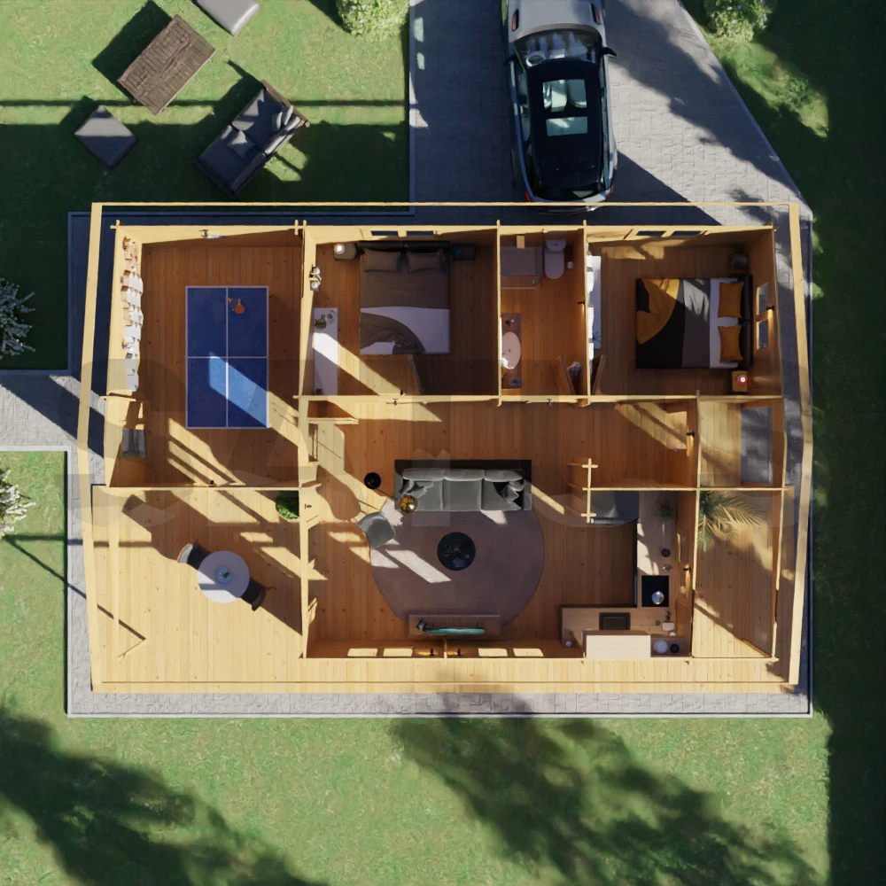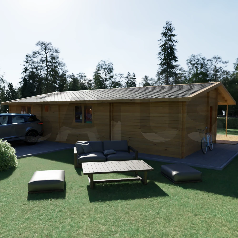 La Cabaña Tradicional “Granada” es una vivienda de madera prefabricada y espaciosa, con un tejado a dos aguas de estilo clásico y una distribución interior pensada para ofrecer comodidad y versatilidad.