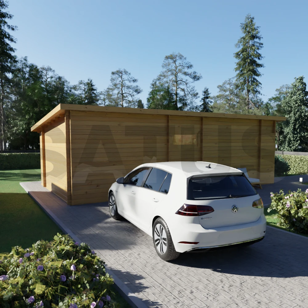 Elige tejado de chapa con canalones o tejas bituminosas en varios colores. De forma opcional, se pueden añadir tableros OSB y mallas impermeables para un mejor aislamiento.