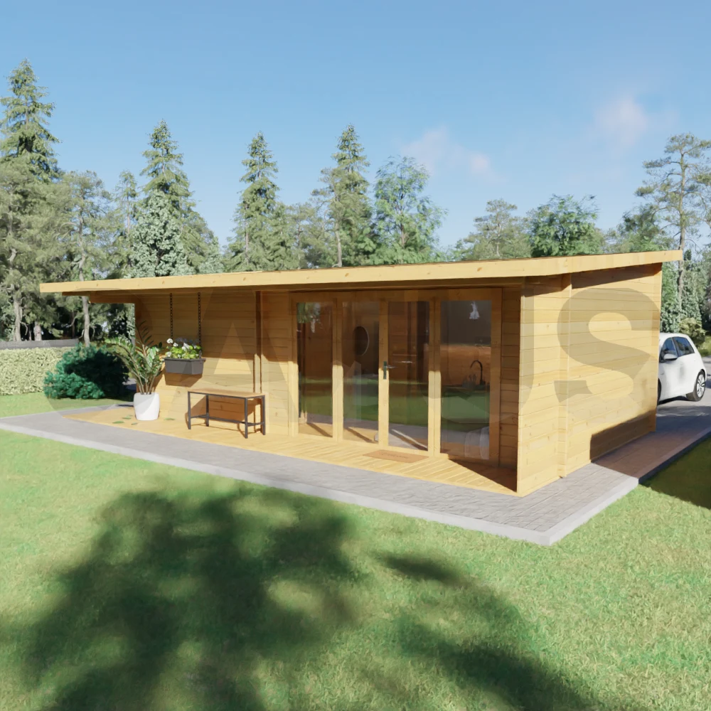 La Cabaña Moderna “Marbella” es una vivienda de madera prefabricada de una sola planta, con un tejado a un agua de estilo contemporáneo que le aporta un carácter elegante y distintivo. Diseñada para quienes valoran los espacios compactos pero acogedores, destaca por sus amplios ventanales y puertas acristaladas, que llenan el interior de luz natural durante todo el día.