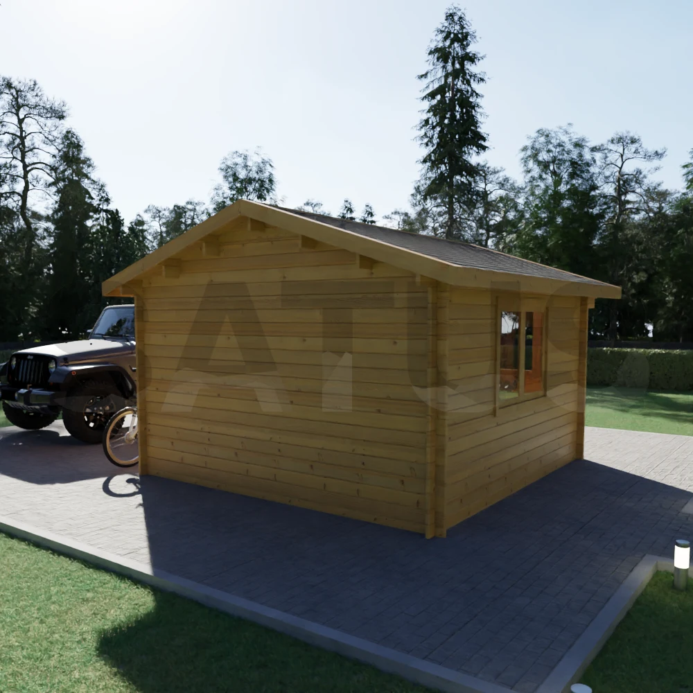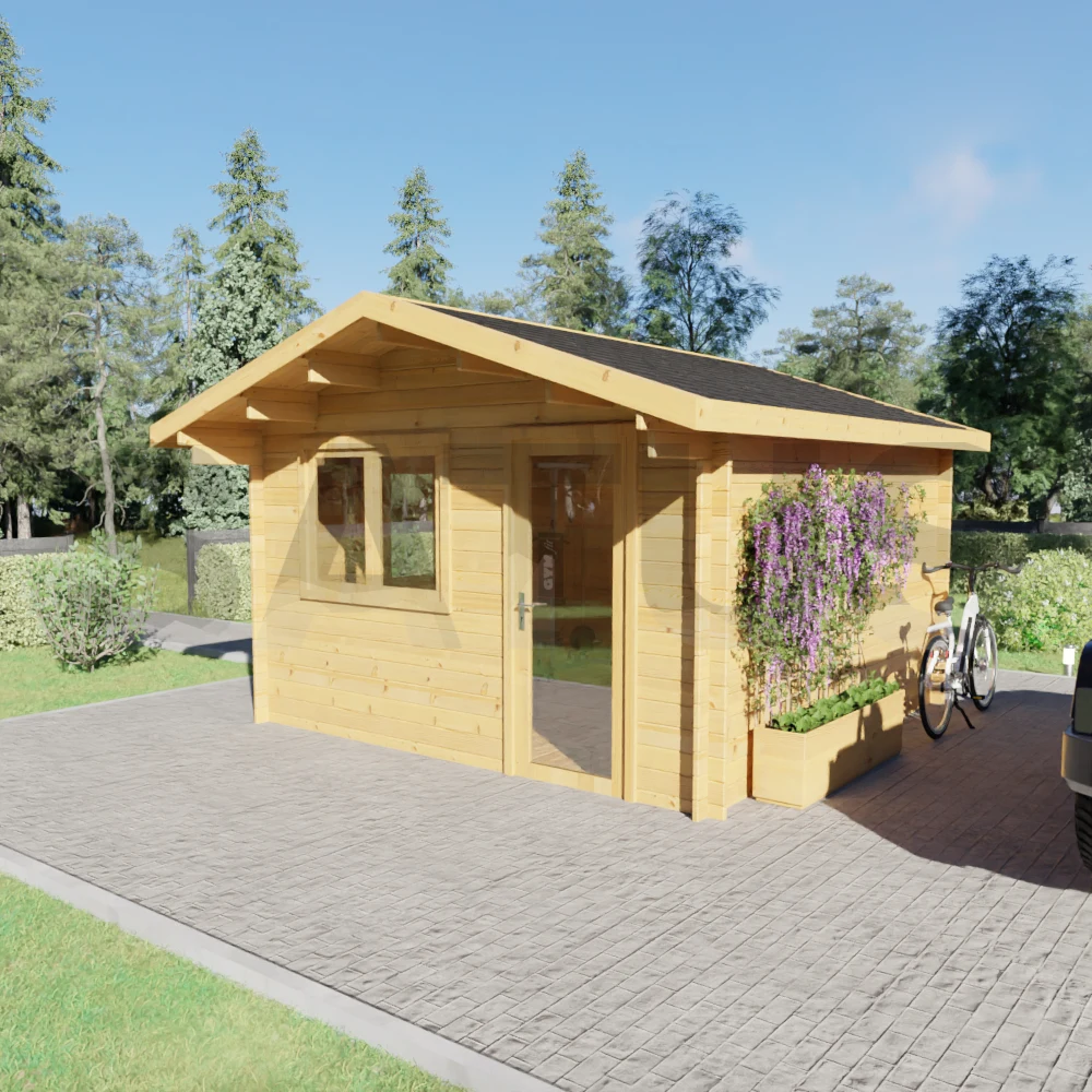 Una casa de jardín compacta de una sola planta con tejado a dos aguas, perfecta para relajarse, montar un taller o disponer de un espacio de almacenaje práctico.